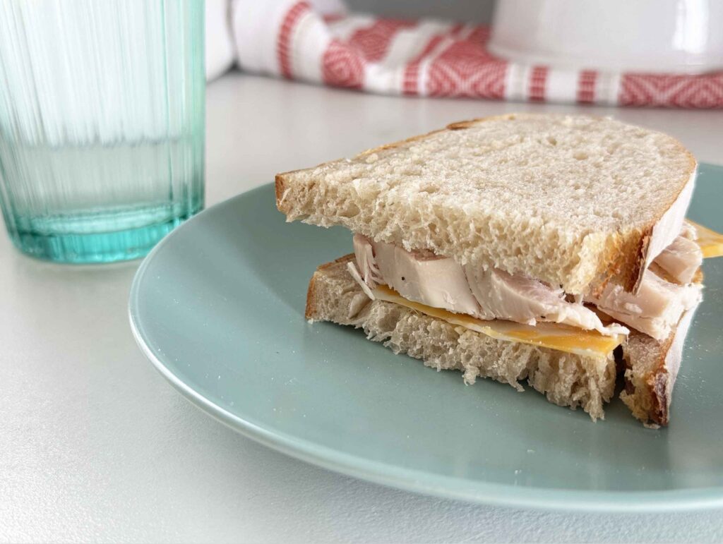 Lunch – Chicken sandwich with chicken from last night, sourdough bread, and a little Colby cheese. Chicken tastes great cold. Really need more fruits or veggies though.