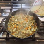 - Make the sauceSprinkle flour over the vegetables and stir for about a minute. Slowly add chicken broth and milk. Stir as it thickens. Don’t worry if it looks thin at first, it will come together.