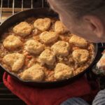 - Add toppingDrop spoonfuls of dough over the filling. Don’t worry about covering it perfectly—gaps are fine. Optional: Roll out your dough and cut out shapes, as I did when I made little heart-shaped biscuits.