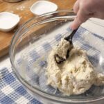 - Make the toppingMix flour, baking powder, salt. Cut in butter, then stir in milk. You’ll get a soft dough. That’s what you want.