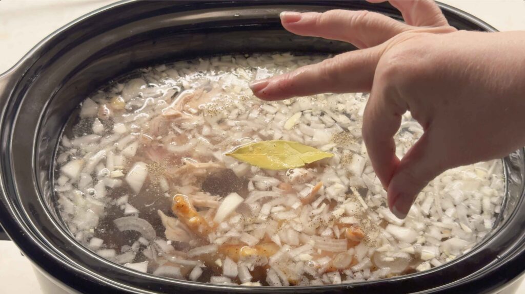 As it cooks, you can skim the surface occasionally to remove foam or excess fat, though this is optional for slow cooker broth since it’s already a gentle process.
