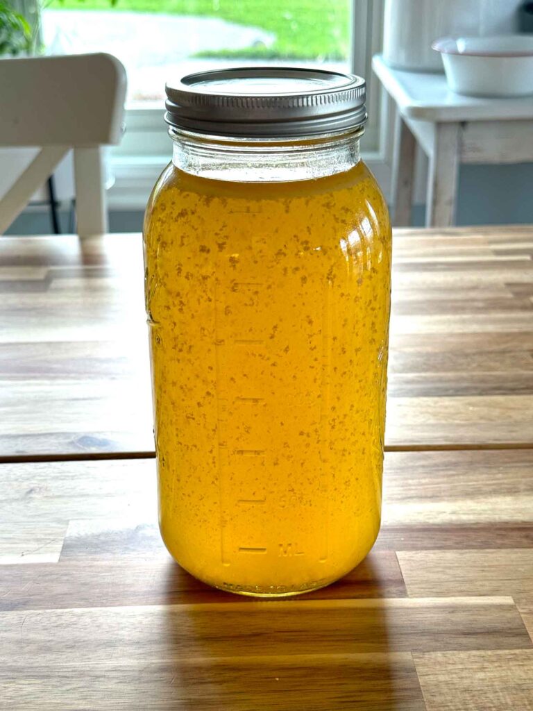 Let your broth cool to room temperature, but don’t leave it out for more than 2 hours. Transfer it to clean glass jars or airtight containers. Mason jars work great. Leave about an inch of headspace at the top if you’re planning to freeze it, because liquid expands when frozen and you don’t want broken jars.