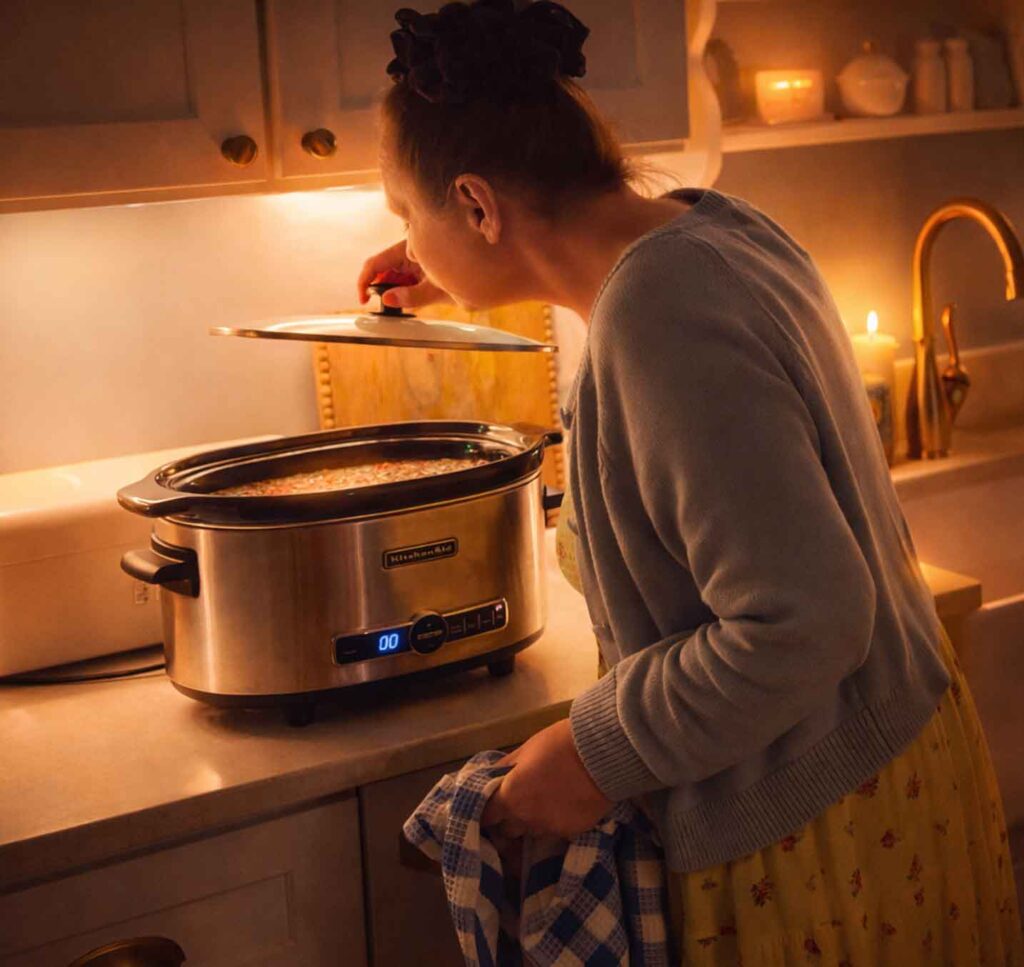- Set to LOW. Cook 8–12 hours (overnight). No stirring, no babysitting.