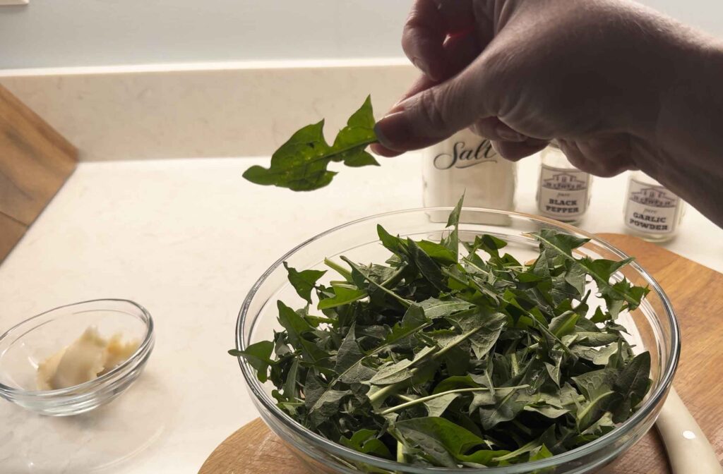 This is the step that changed everything for me. Dandelion greens can be bitter, a little intense, and taste stronger than something like spinach or arugala.
