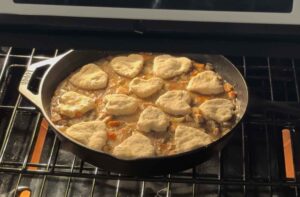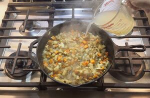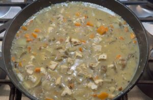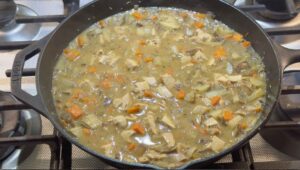 Make the sauceSprinkle flour over the vegetables and stir for about a minute. Slowly add chicken broth and milk. Stir as it thickens. Don’t worry if it looks thin at first, it will come together.