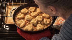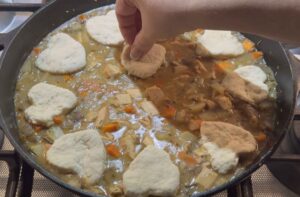 Add toppingDrop spoonfuls of dough over the filling. Don’t worry about covering it perfectly—gaps are fine. Optional: Roll out your dough and cut out shapes, as I did when I made little heart-shaped biscuits.