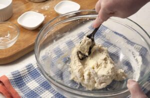 Make the toppingMix flour, baking powder, salt. Cut in butter, then stir in milk. You’ll get a soft dough. That’s what you want.